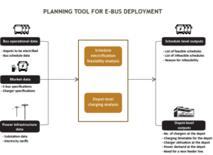 CSTEP has developed the Planning Tool for Electric Bus Deployment to support state transport undertakings and electricity distribution companies in their decision-making process while deploying e-buses. This version of the tool aims to assess depot-based charging requirements for existing fleet operations. It performs feasibility analyses to identify schedules that are suitable for operating e-buses and estimates the resulting power and energy consumed in charging these e-buses at the selected depots. This tool can be used to generate charging plans for operating e-buses in cities across India.