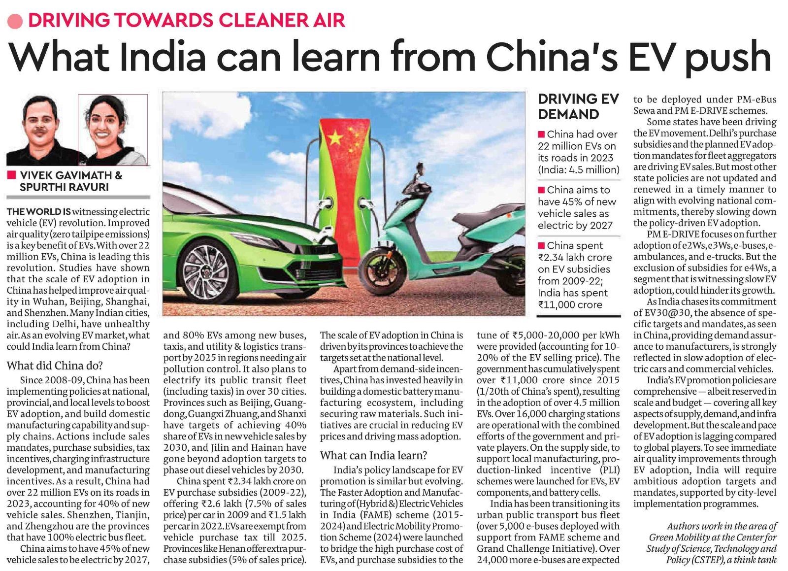 The world is witnessing electric vehicle (EV) revolution. Improved air quality (zero tailpipe emissions) is a key benefit of EVs. With over 22 million EVs, China is leading this revolution. Studies have shown that the scale of EV adoption in China has helped improve air quality in Wuhan, Beijing, Shanghai, and Shenzhen. Many Indian cities, including Delhi, have unhealthy air. As an evolving EV market, what could India learn from China?