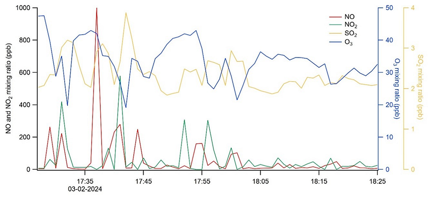 DG sets also emit SO2, which oxidises to form sulphate aerosols that contribute to ambient air pollution. Figure 3 shows two episodes of sporadic increases in NO, NO₂, and SO₂ levels. When NO emissions are released from the DG set, a dip in ground-level ozone is observed because of the fast reaction between NO and ozone to produce NO2.
